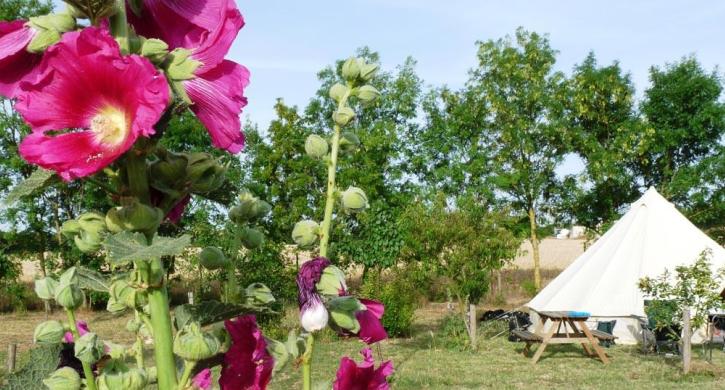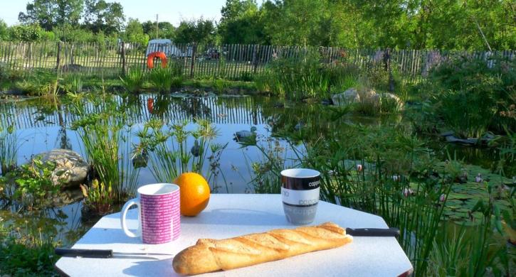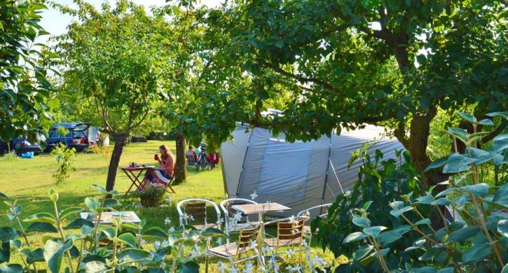Ein Campingplatz, auf dem Sie jeden Morgen frisches Brot und Croissants kaufen können, um unter den Obstbäumen bei Vogelgezwitscher zu frühstücken.