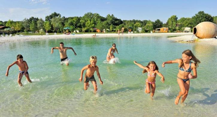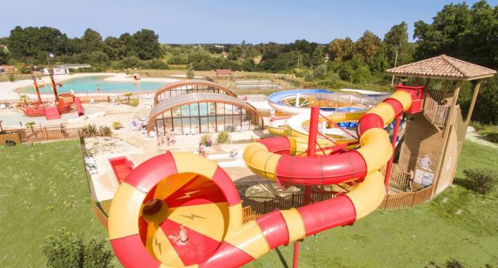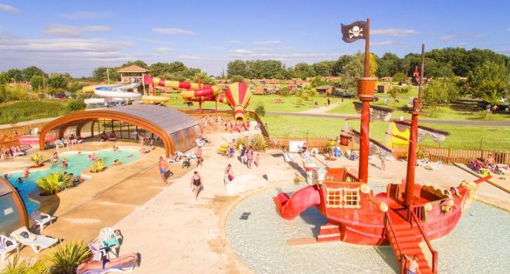 Der Campingplatz verfügt über einen herrlichen Wasserbereich mit einem Naturschwimmbad und weißen Sandstränden, einem überdachten und beheizten Schwimmbad, einem Planschbecken für Kinder mit einem Piratenschiff, zwei Rutschen sowie den berühmten sensationellen Rutschen, dem Crazy cone und dem Spacebowl, für die Größeren!