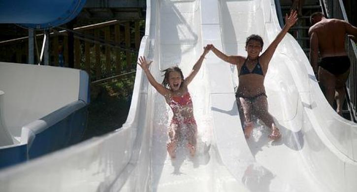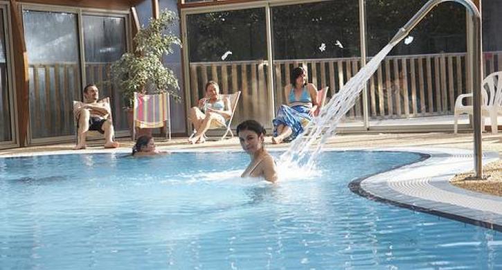 Badelandschaft: überdachter und beheizter Whirlpool 7x7 - beheiztes Hallenbad mit Spa und Planschbecken und im Außenbereich ein Schwimmbecken, ein Planschbecken und 3-bahnige Wasserrutschen.